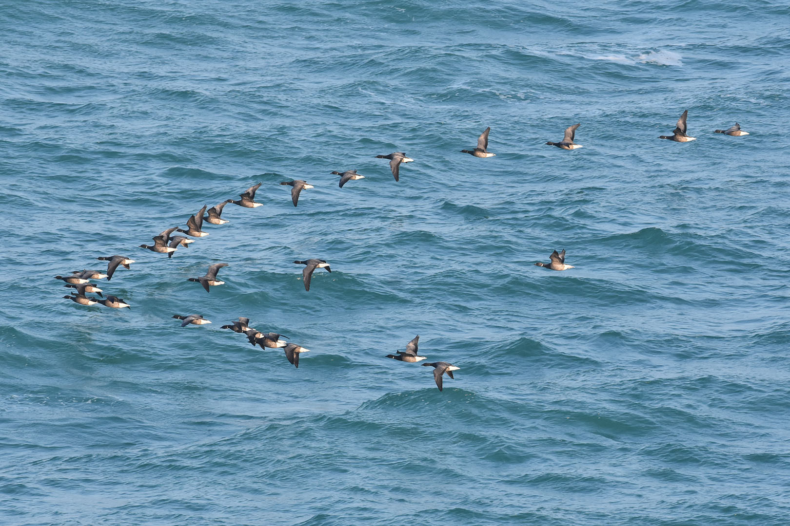 Les bernaches tirent leurs noms des bernacles, car la croyance populaire raconte qu’elles éclosent de ce crustacé qui vit attaché aux rochers… une légende parfaite pour une oie souvent marine, taillée pour la nage. Les bernaches comprennent plusieurs espèces dont deux affectionnent particulièrement le littoral entre le bassin d’Arcachon et le Cotentin pour l’hivernage : la bernache cravant à ventre clair et la bernache cravant à ventre sombre. Comme toute oie qui se respecte, elles sont strictement phytophages et se nourrissent, en bord de mer, en broutant des plantes et des algues vertes et, en milieu terrestre, de l’herbe et des céréales.