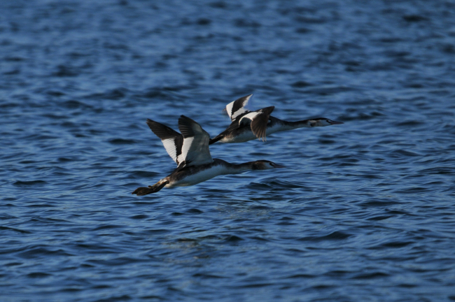 Parmi les grèbes, que l’on regroupe en vingt-deux espèces, certains sont visibles à l’année ; les autres, qui sont de type migrateur, nous arrivent généralement à l’automne, poussés par la rigueur des régions septentrionales où ils se reproduisent. La plupart hiverne en groupe. Les grèbes se plaisent soit sur l’eau, soit sous l’eau, et sont peu adaptées à la marche sur terre où ils ne vont que très rarement. Le vol n’est pas non plus leur spécialité car leurs ailes sont relativement petites et leur musculature pectorale est peu développée. Tous les grèbes sont par contre de remarquables plongeurs. Ainsi, le grèbe castagneux, plongeur à répétition infatigable, peut rester de 10 à 30 secondes sous la surface. Le grèbe huppé plonge avec une douceur caractéristique et ne provoque que de légers remous. Ils sont présents en Bretagne et en Manche, tout comme le grèbe à cou noir et le grèbe esclavon.