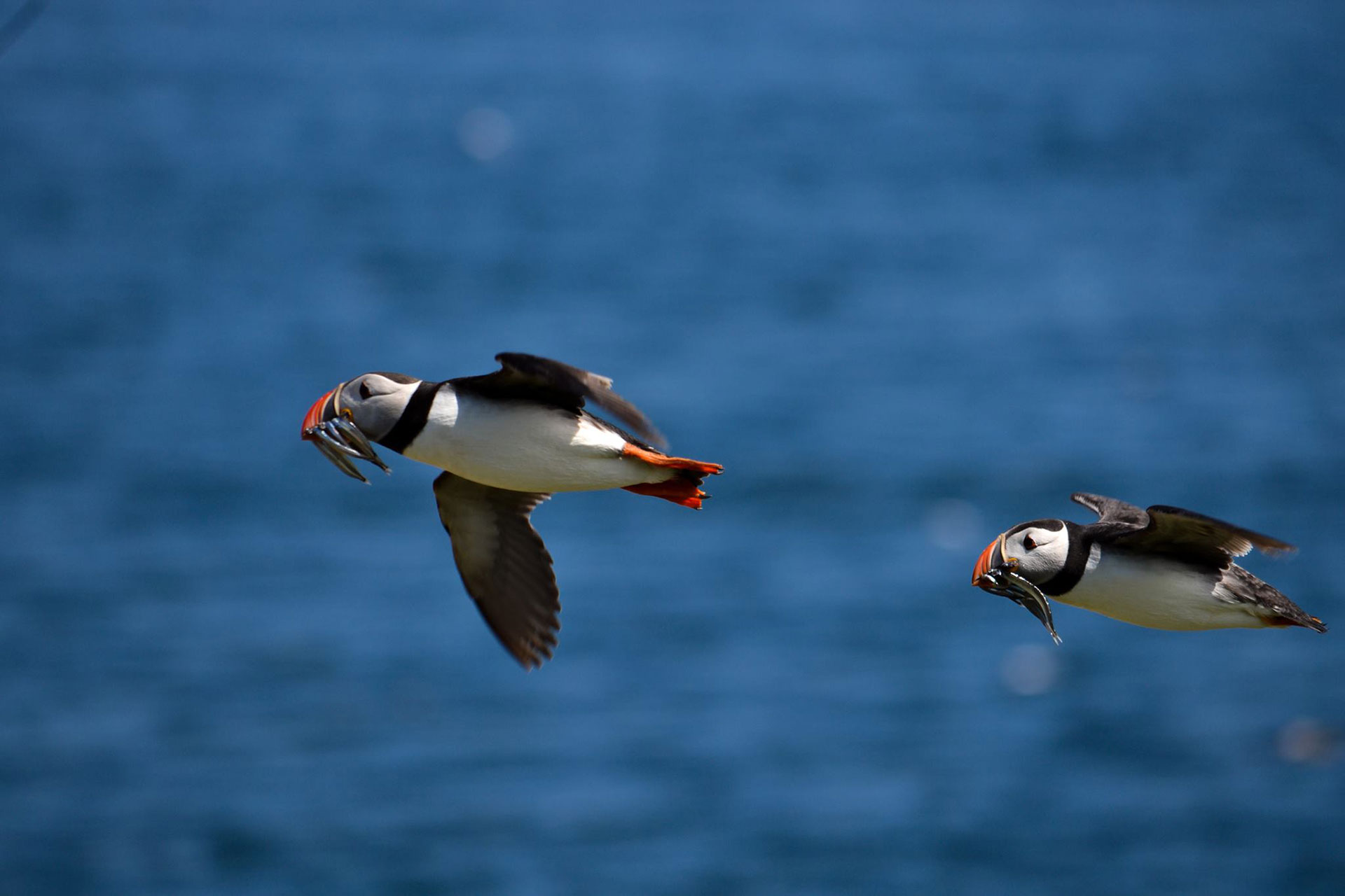 - En mer, les macareux moines pêchent pour leurs petits et se regroupent parfois en radeaux de plusieurs individus. Observez-les à distance.