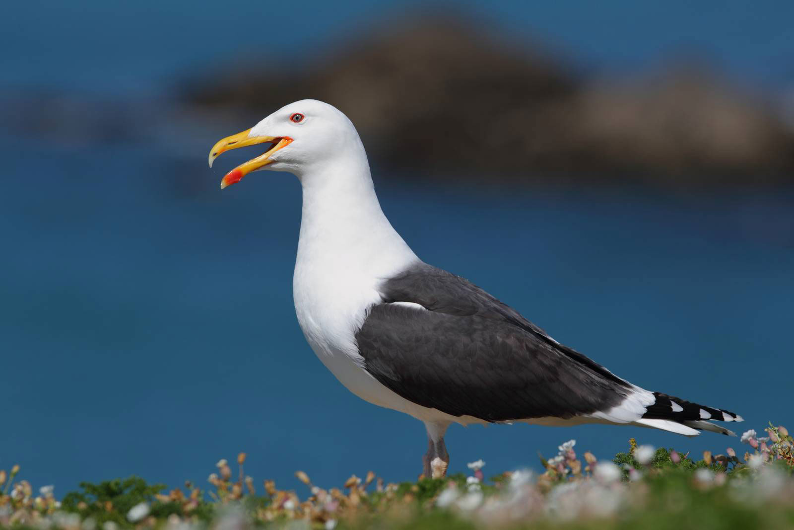 Dans la famille goéland, le goéland marin, c’est Monsieur Plus… Sa taille est plus importante, son cri plus rauque, son vol plus puissant, et son comportement de prédateur beaucoup plus marqué que chez la plupart de ses cousins. Ses techniques de chasse impitoyables lui permettent de maîtriser des oiseaux en vol et de ravager leurs sites de nidification.