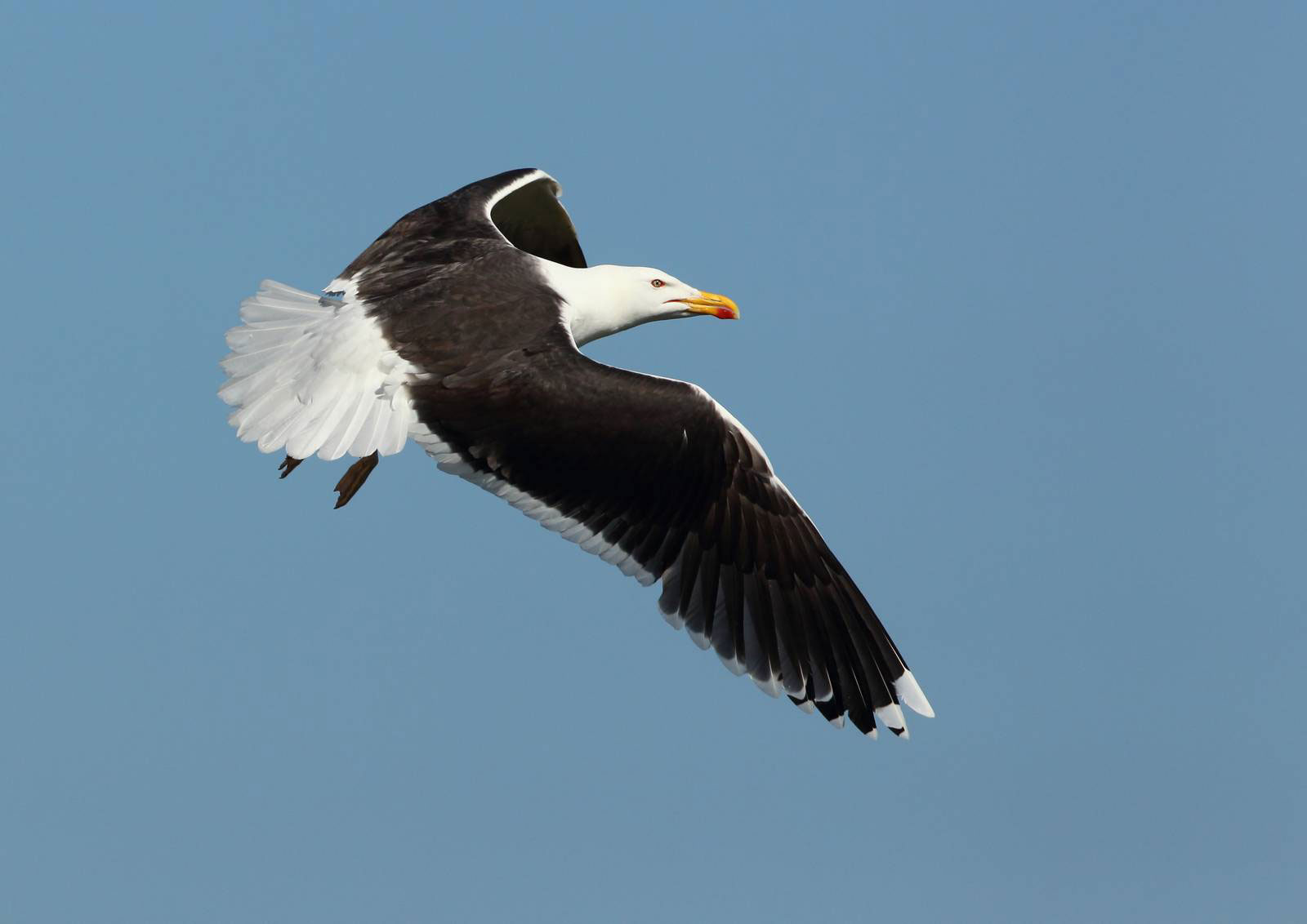 Le goéland marin est le plus imposant du groupe des « grands goélands à tête blanche ». Visible à terre à 50 m, il est plus massif que les autres. Dans le ciel, sa silhouette trapue donne l’impression d’un vol lourd.