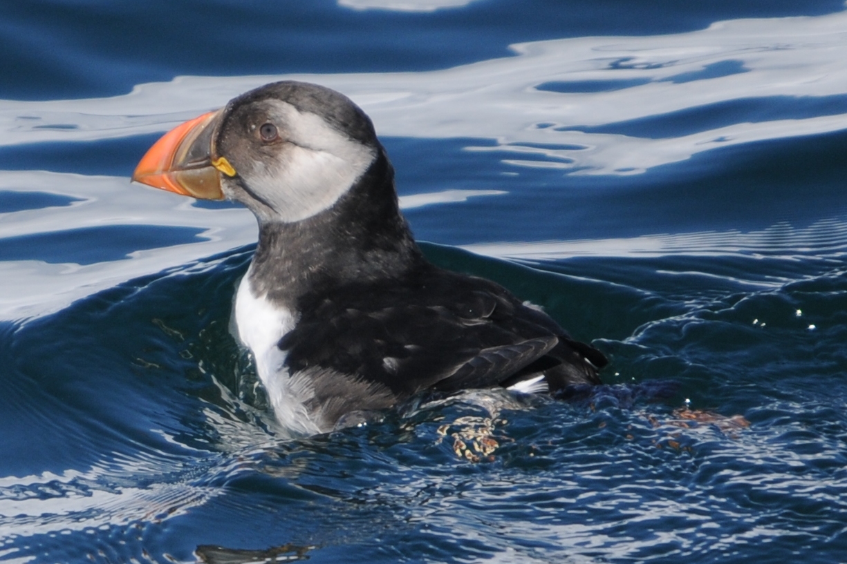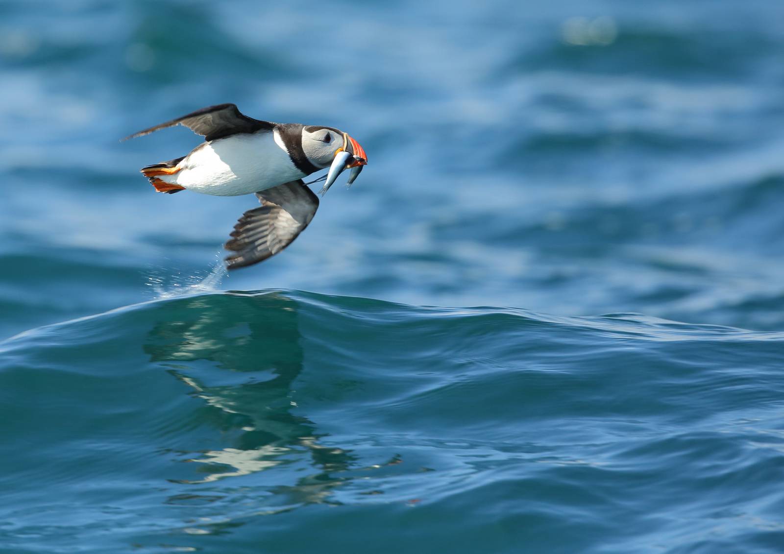 • En mer, les macareux moines pêchent pour leurs petits et se regroupent parfois en radeaux de plusieurs individus. Observez-les à distance.