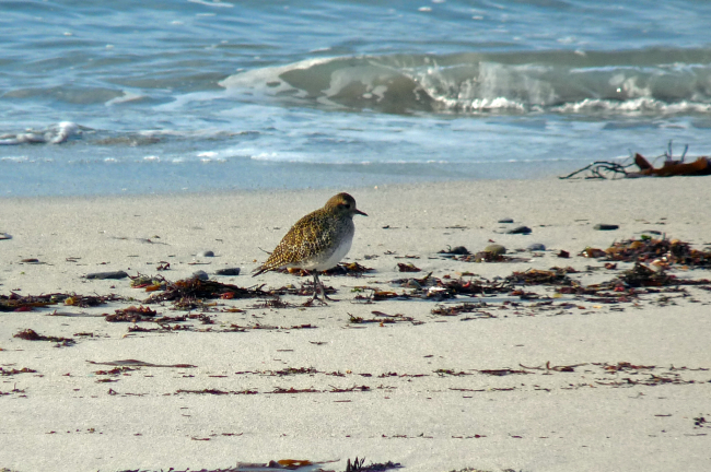 Les pluviers sont de petits échassiers limicoles et migrateurs, qui doivent leur nom au fait qu’on les voit souvent apparaître dans nos régions à l’automne, saison des pluies. L’appellation des deux espèces hivernant en Bretagne, le pluvier doré et le pluvier argenté, laisse espérer un plumage prometteur : mais ils n’arborent leurs habits de gala mordorés qu’au printemps, en période de reproduction, et adoptent pour la migration un modeste complet de voyage cendré, que vous avez le plus de chances d’apercevoir. On prête à la femelle pluvier un certain sens de la ruse : pour protéger sa couvée, lorsqu’un prédateur est en approche, elle simule une aile blessée et paraît se traîner, incapable de fuir. Ainsi, l’intrus pense avoir affaire à une proie facile et se détourne des poussins.